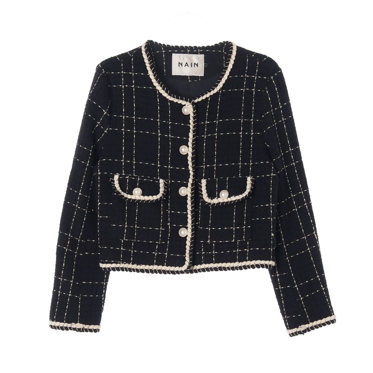 나인 블랙 화이트 트위드 진주버튼 재킷