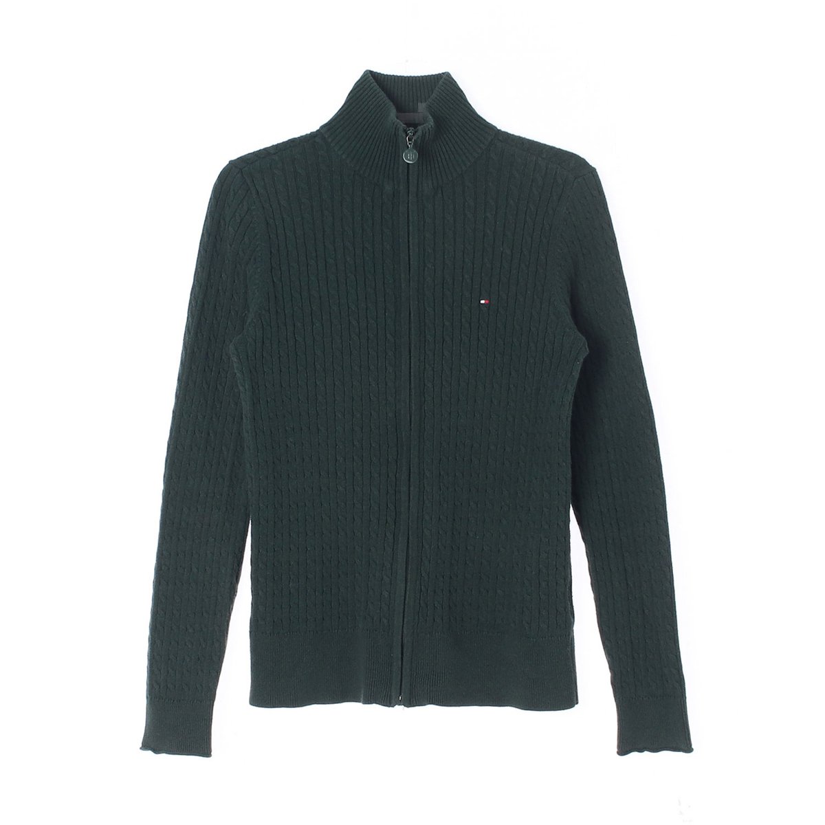 타미힐피거 그린 꽈배기 하이넥 집업 가디건 재킷
